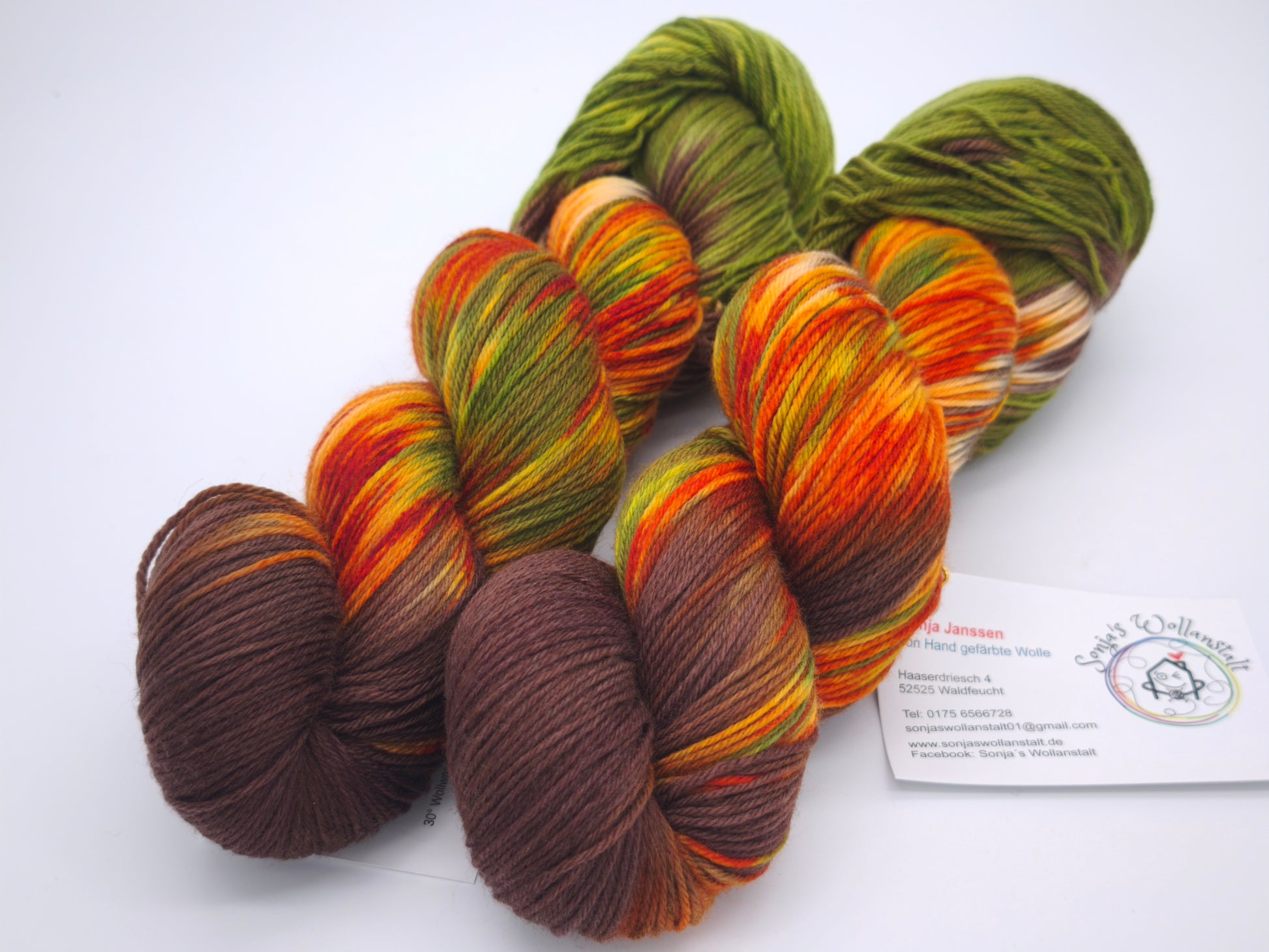 Bitte bedenke das bei Handgefärbten Garnen jeder Strang ein Unikat ist. Auch wenn die Stränge aus dem gleichen Farbbad kommen, können sie Unterschiede aufweisen. Damit diese Unterschiede bei größeren Strickstücken nicht so auffallen empfehlen wir mit 2 Strang/Knäuel gleichzeitig zu stricken. Immer 2 Reihen je Strang.
